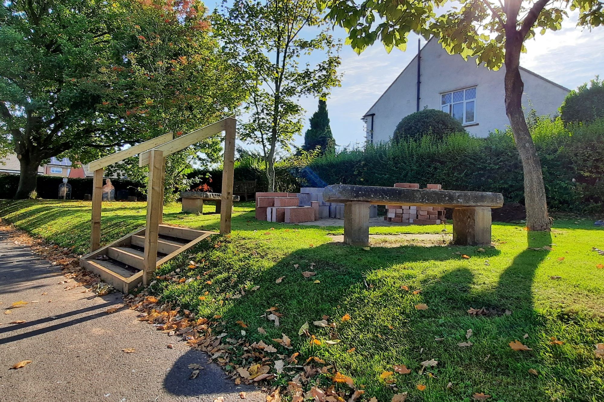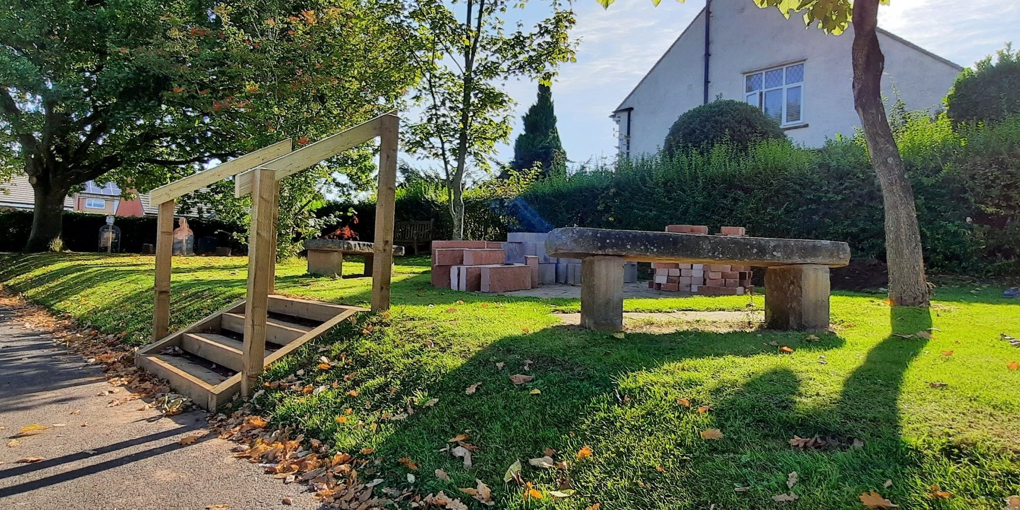 Story Construction helped develop the memorial garden with Mrs McGaffin (our Forces Liaison Officer) and the students, and it is now a lovely reflective place to sit, with access via new steps. This area is where we place the wreaths after our Remembrance service, and we’re looking forward to enhancing it with planting in time for the commemorations.